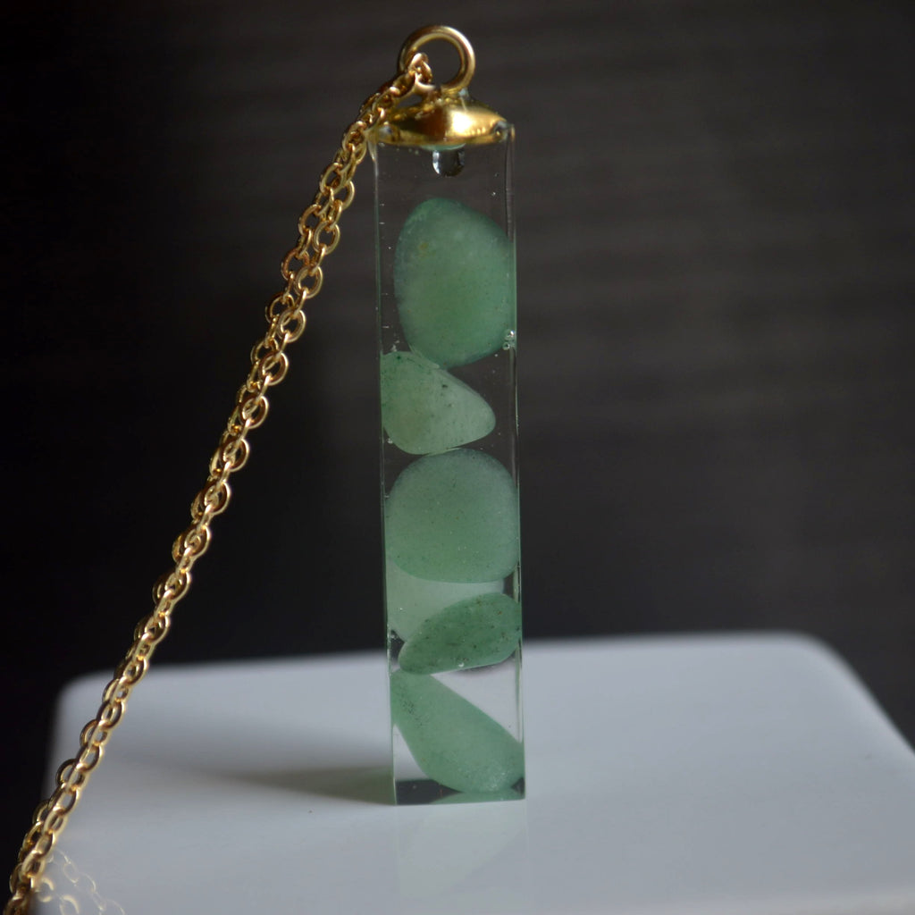 Long green natural stone necklace with gold coloured chain. Pendant size is approximately 10mm x 45mm.
